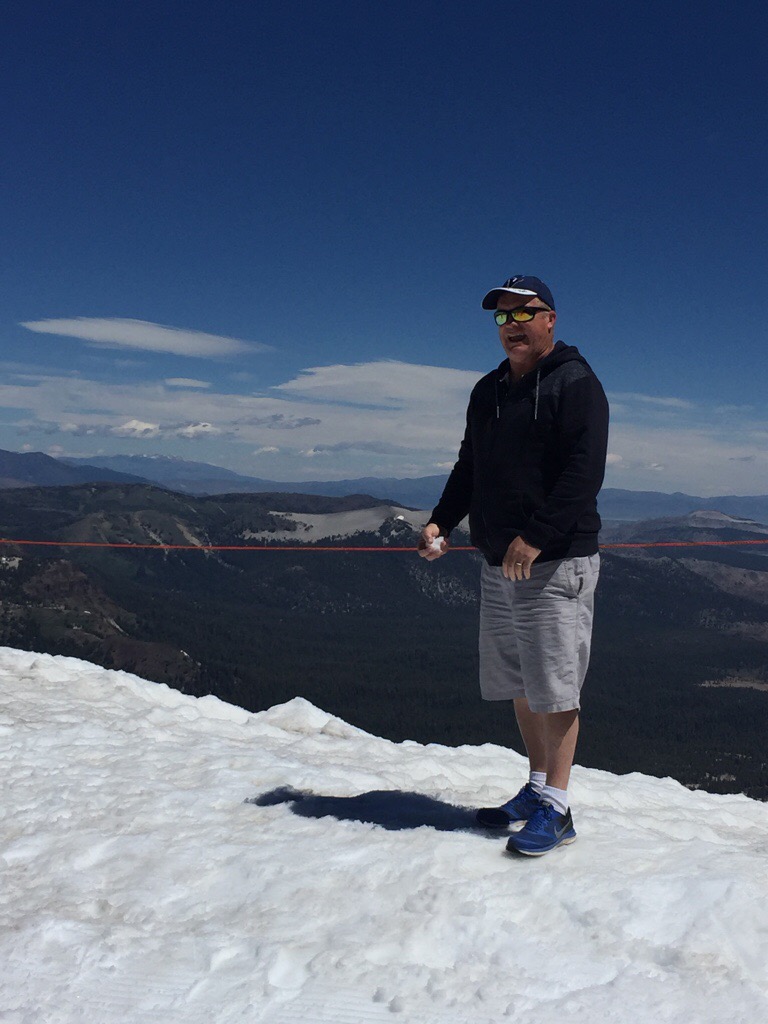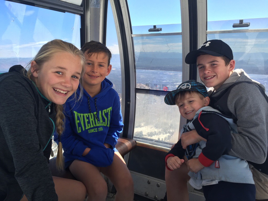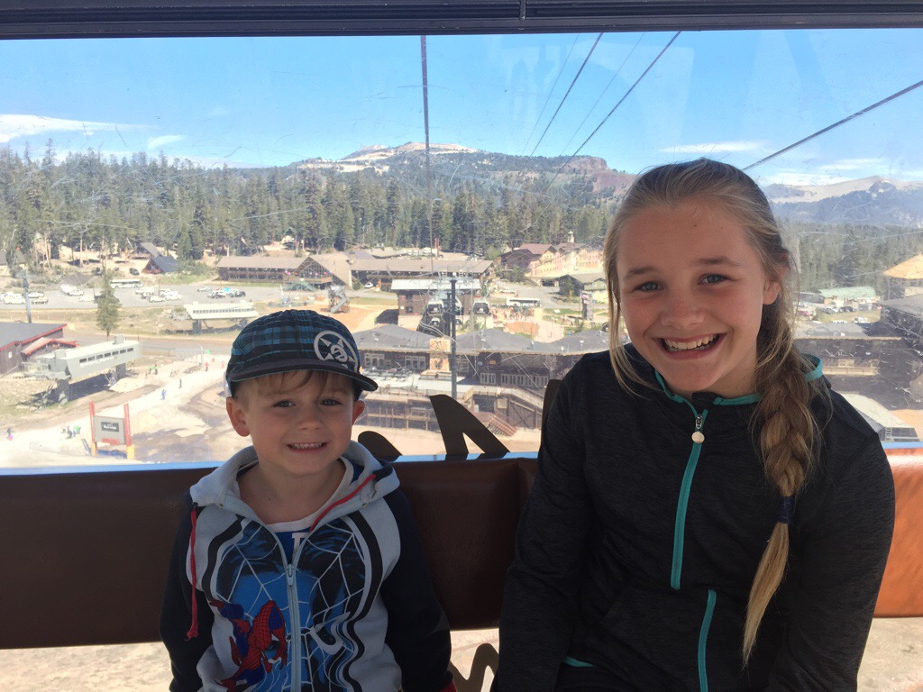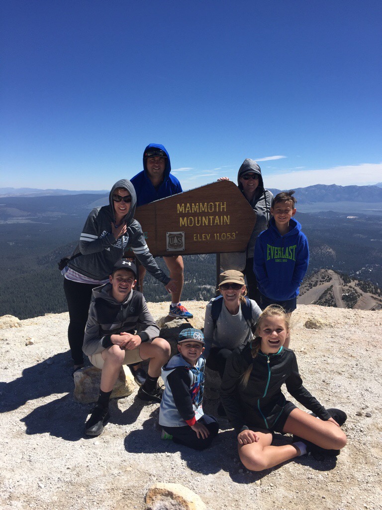 Our last night in Mammoth Lakes me and Adam went out for dinner leaving kids with Nana. Best meal I have ever had. Salmon on risotto. Delicious. The next morning we woke early and Max and Adam hired fishing gear and went trout fishing and the rest of us went up to the ski fields and went on the Gondola. It was amazing, the scenery here is out of this world. We can’t believe we are having snowball fights in our shorts and T-shirts. At the top of the mountain we took a photo views spectacular.