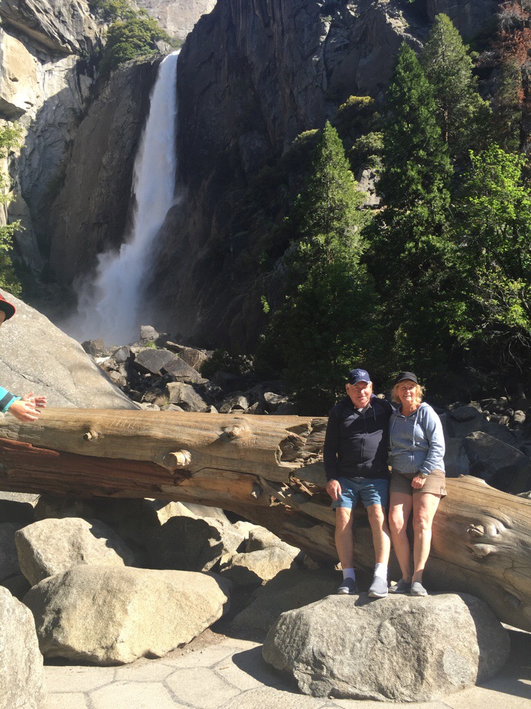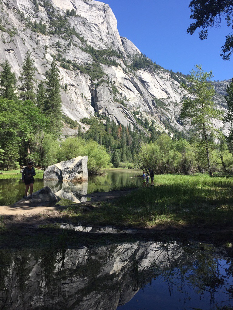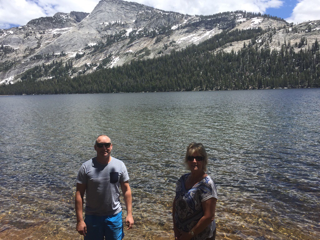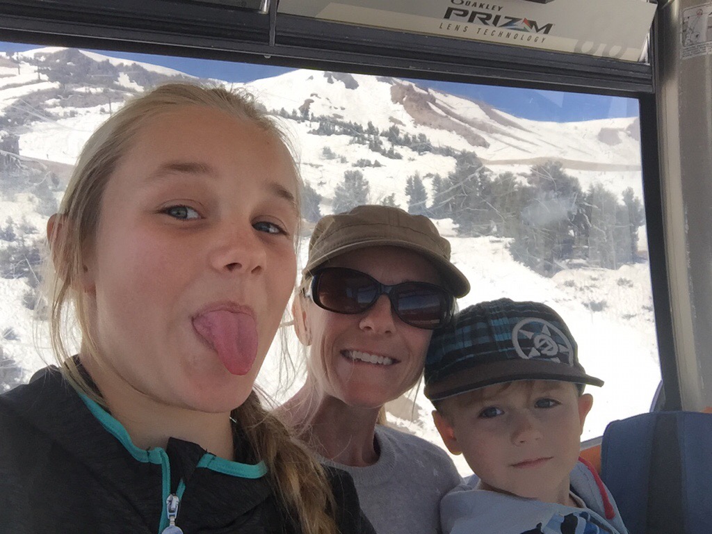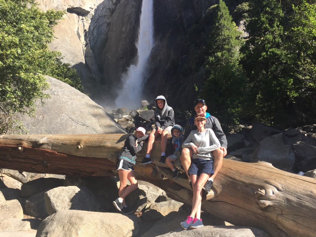 Our last night in Mammoth Lakes me and Adam went out for dinner leaving kids with Nana. Best meal I have ever had. Salmon on risotto. Delicious. The next morning we woke early and Max and Adam hired fishing gear and went trout fishing and the rest of us went up to the ski fields and went on the Gondola. It was amazing, the scenery here is out of this world. We can’t believe we are having snowball fights in our shorts and T-shirts. At the top of the mountain we took a photo views spectacular.
